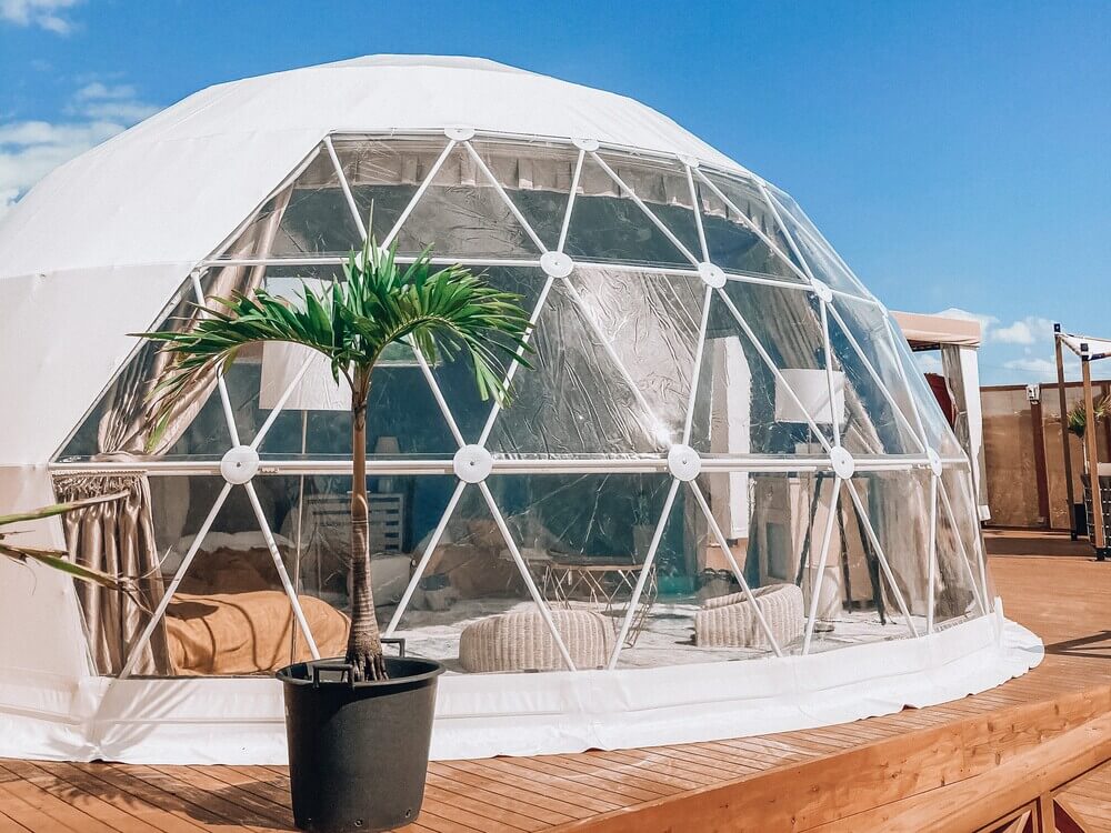 宿泊するのは沖縄初上陸のドームテント。美しいコバルトブルーの海を正面に望む抜群のロケーションは、まるで無人島に来たような気分に浸れる完全プライベート空間。