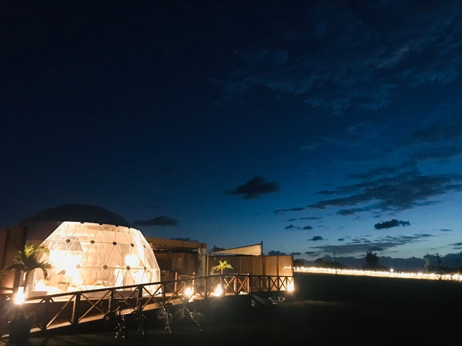 ディナーは、伊江島の食材や沖縄の伝統的な調理を取り入れた創作料理と、スタッフが目の前で焼く贅沢なBBQコース。ドームテント横のテラスにはBARスペースがあるので、焚火の炎に癒されながら伊江島産貴重ラム酒や伊江島泡盛など、地産のお酒も味わうことができる。