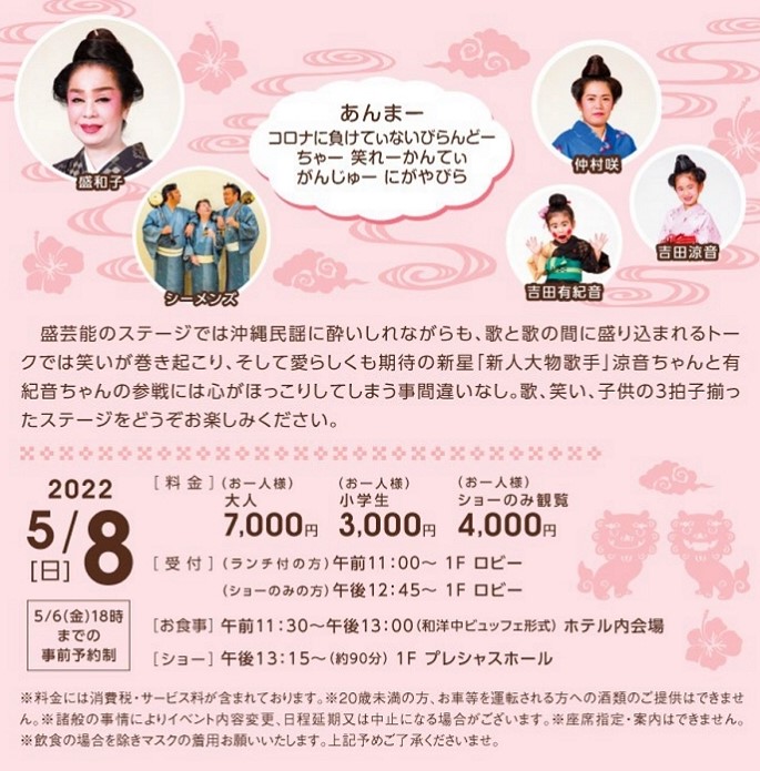 沖縄民謡を堪能しながらも、歌と歌の間に盛り込まれるトークでは笑いが起こる盛芸能のステージに、可愛らしくも期待の新星・新人大物歌手の涼音ちゃんと有紀音ちゃんの参戦には見ていてほっこり、癒されること間違いなし。