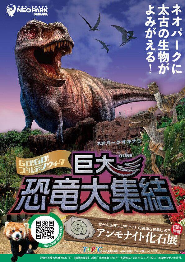 名護市にあるネオパークオキナワで、2022年4月29日(金・祝)~8月31日(水)の期間中、巨大恐竜に会える「GO!GO!ゴールデンウィーク」を開催する。