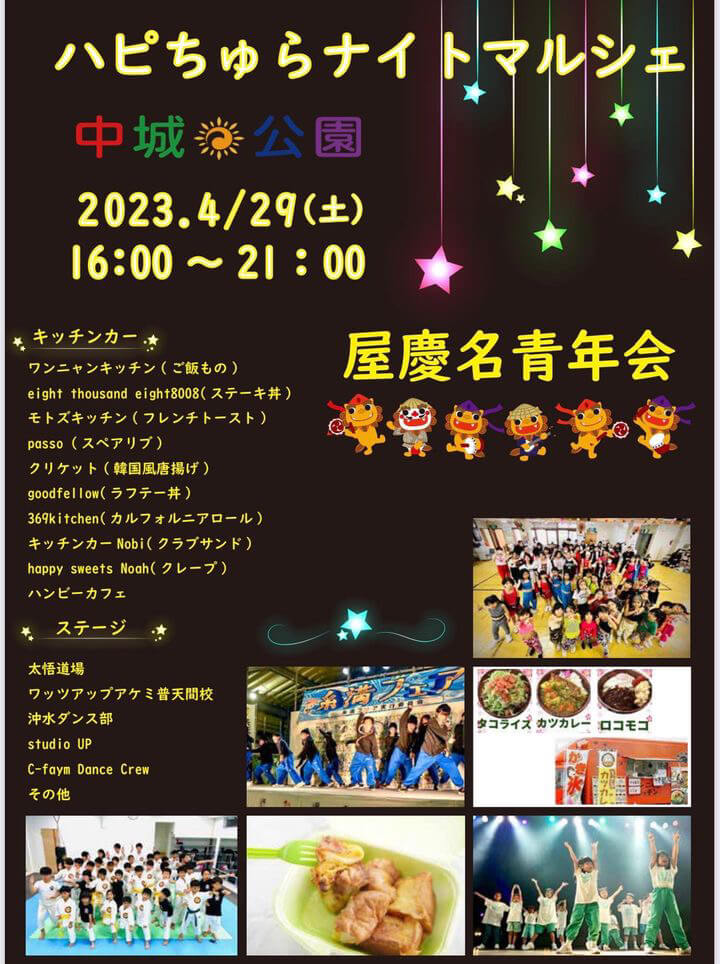 2023年4月29日(土・祝)に、北中城村の中城公園にて「ハピちゅらナイトマルシェ in 中城公園」が開催される。