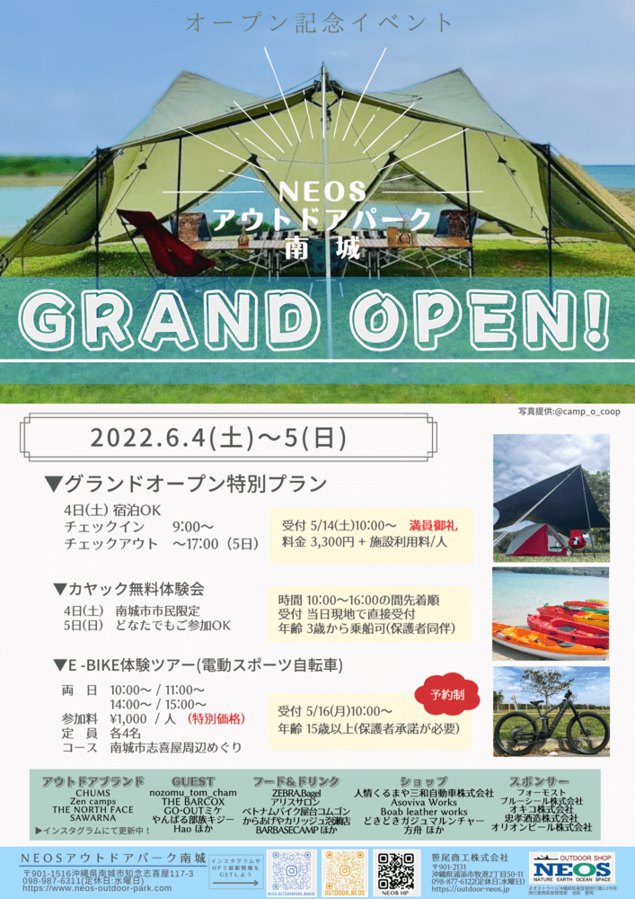 2022年6月4日(土)・5日(日)の2日間、南城市にグランドオープンする「NEOSアウトドアパーク南城」の記念イベントが開催。