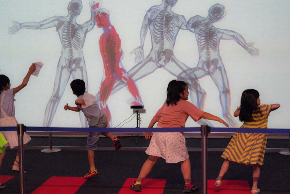 スクリーンの前に立つと自分の体が透けて骨や血管、筋肉が映し出される「にんげんスケスケ」では、自分の体の内側がどうなっているのかを観察することができる。