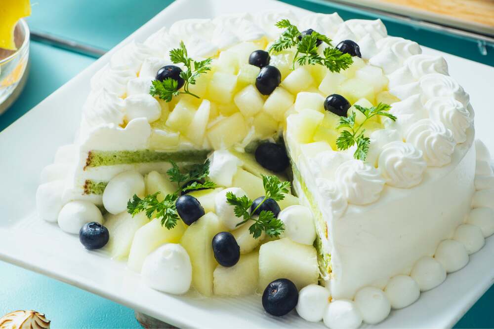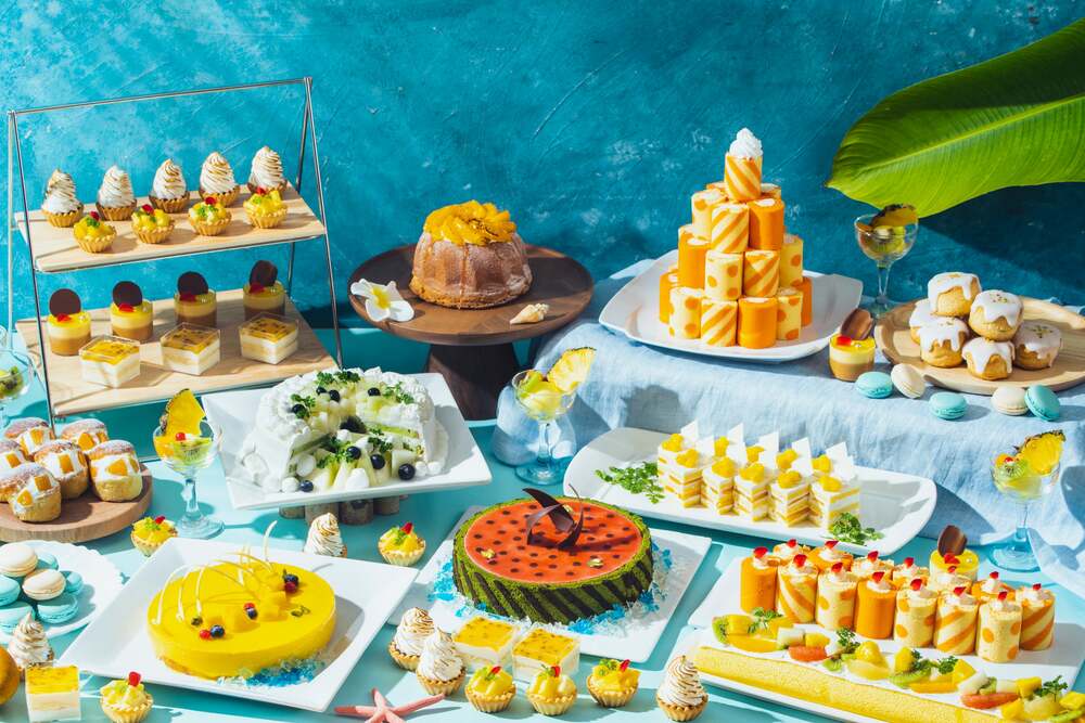 今回は初夏をテーマに、沖縄で生産されたフルーツをふんだんに使用したスイーツが登場。スイカのレアチーズケーキやマンゴーピスタチオムースケーキ、メロンショートケーキなど、約15種類の可愛いサマースイーツたちがブッフェ台を彩る。