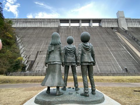 2日目は進撃の巨人ゆかりの地を巡るシャトルタクシーツアーに参加。はじめに訪れるのは「大山ダム銅像」。大山ダムの壁面をウォール・マリアに見立て、初めて巨人が襲ってきた「はじまりの場所」が再現されており、エレン・ミカサ・アルミンの少年期の銅像が設置されている。