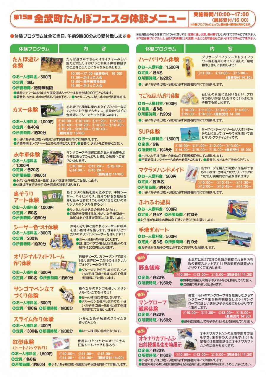 たんぼ遊びの他にも、カヌーやSUP、手漕ぎボートなどのアクティブな体験や、ものづくり体験が盛りだくさん。島ぞうりアートにシーサーの色付け、紅型体験など、「第15回 金武町たんぼフェスタ」の思い出としてお土産にももってこいのイベントばかり。