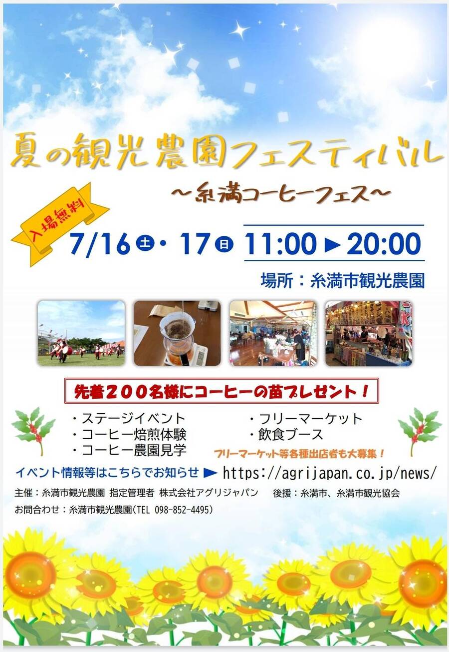 2022年7月16日(土)・17日(日)、糸満市にある糸満市観光農園で入場無料の「夏の観光農園フェスティバル~糸満コーヒーフェス~」が開催。