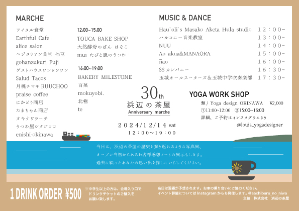 2024年12月14日(土)、南城市にある浜辺の茶屋の30周年を記念して、特別イベント「浜辺の茶屋30周年マルシェ」が開催される。