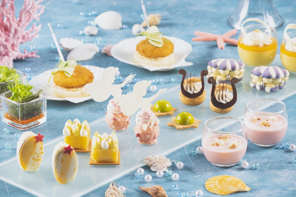 童話「人魚姫」から着想を得た2部構成のアフタヌーンティーとなっており、前編となる今回は美しい歌声を響かせるプリンセスマーメイドと海の仲間たちによる楽しい音楽会を表現。