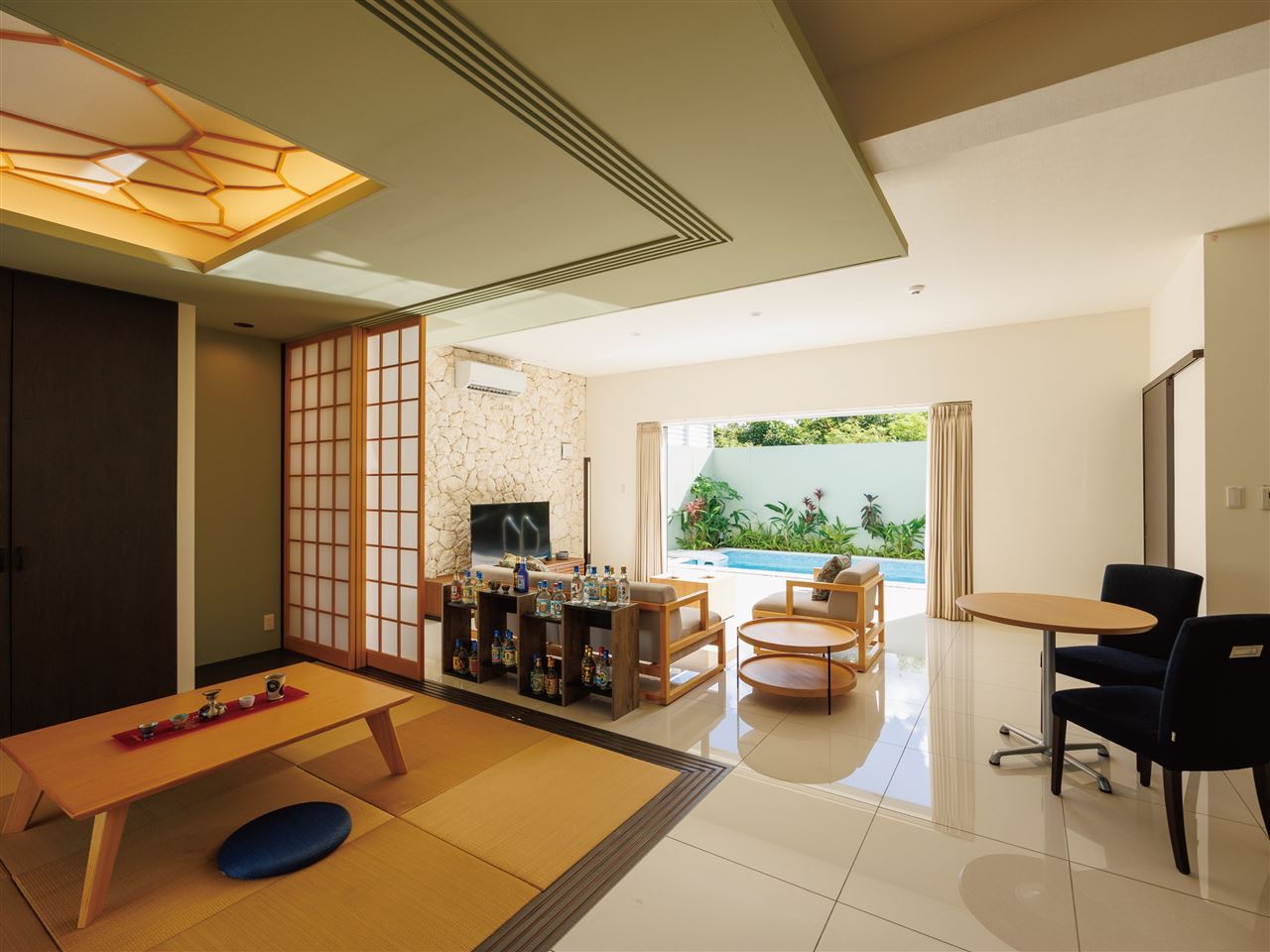 お部屋は屋外ジャグジーとテラス付きの完全独立型スイートヴィラ。テラスを含む広さは129~189平米もあり、室内にはミニキッチンを有するLDK、琉球畳の和室も備えた十分な寛ぎ空間となっている。お部屋の冷蔵庫にはフリードリンクを準備しており、利用可能。