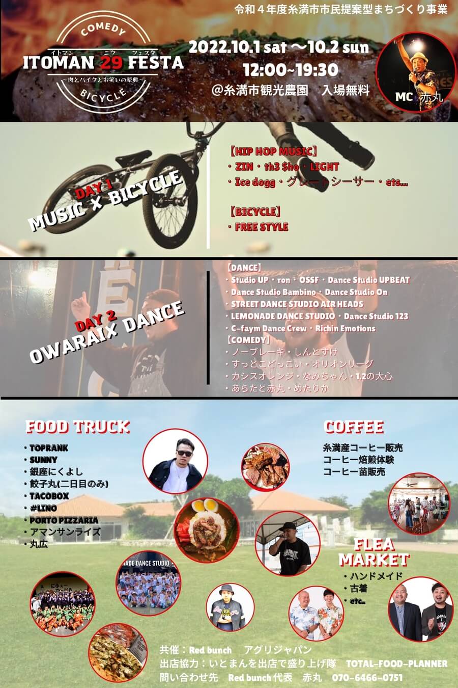 2022年10月1日(土)・2日(日)、糸満市にある糸満市観光農園で「ITOMAN 29 FESTA ~肉とバイクとお笑いの祭典~」が開催される。