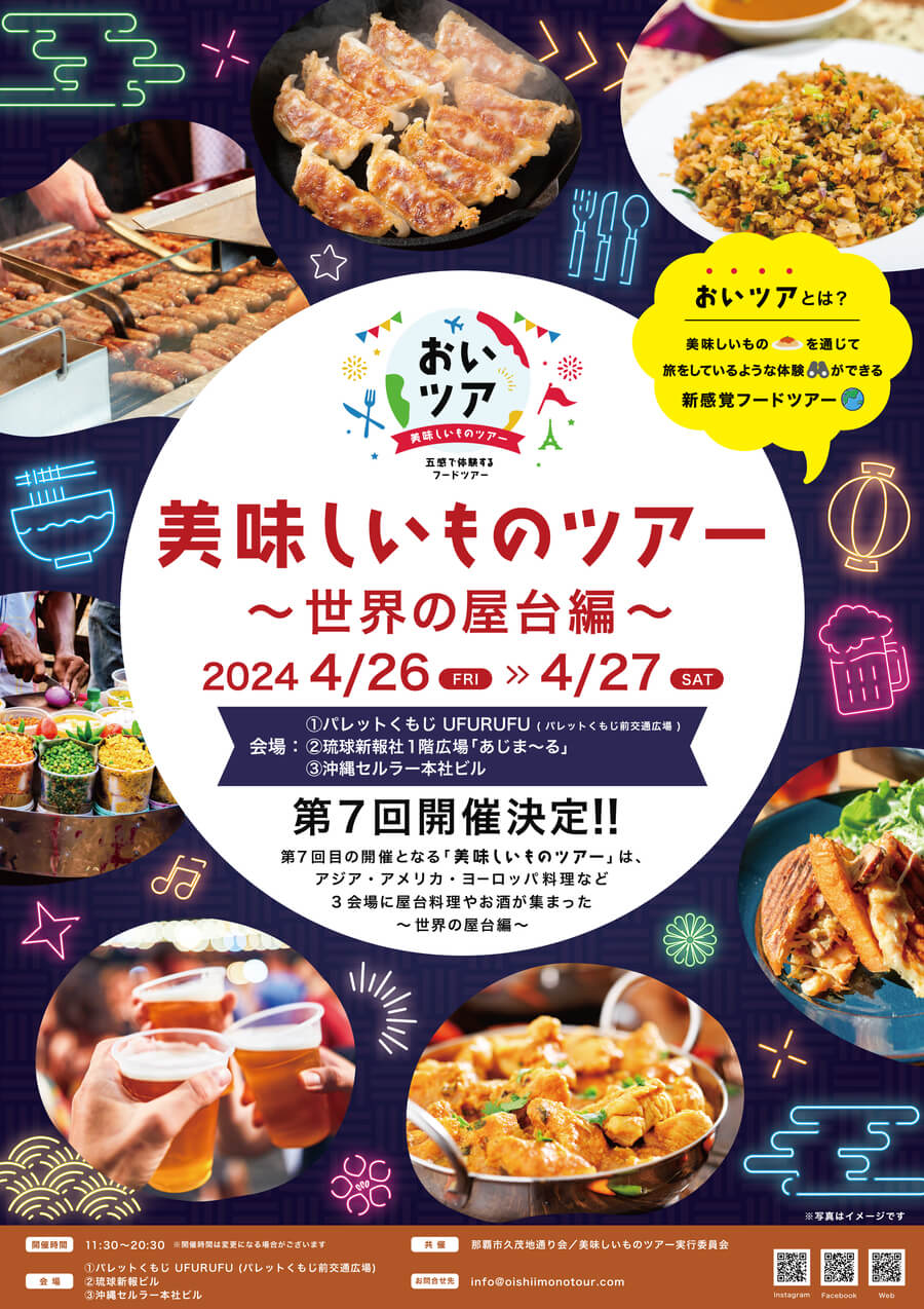 2024年4月26日(金)・27日(土)の2日間、那覇市内のパレットくもじ UFURUFU、琉球新報社1階広場「あじま~る」、沖縄セルラー本社ビルの3会場にて「美味しいものツアー2024~世界の屋台編~」が開催される。