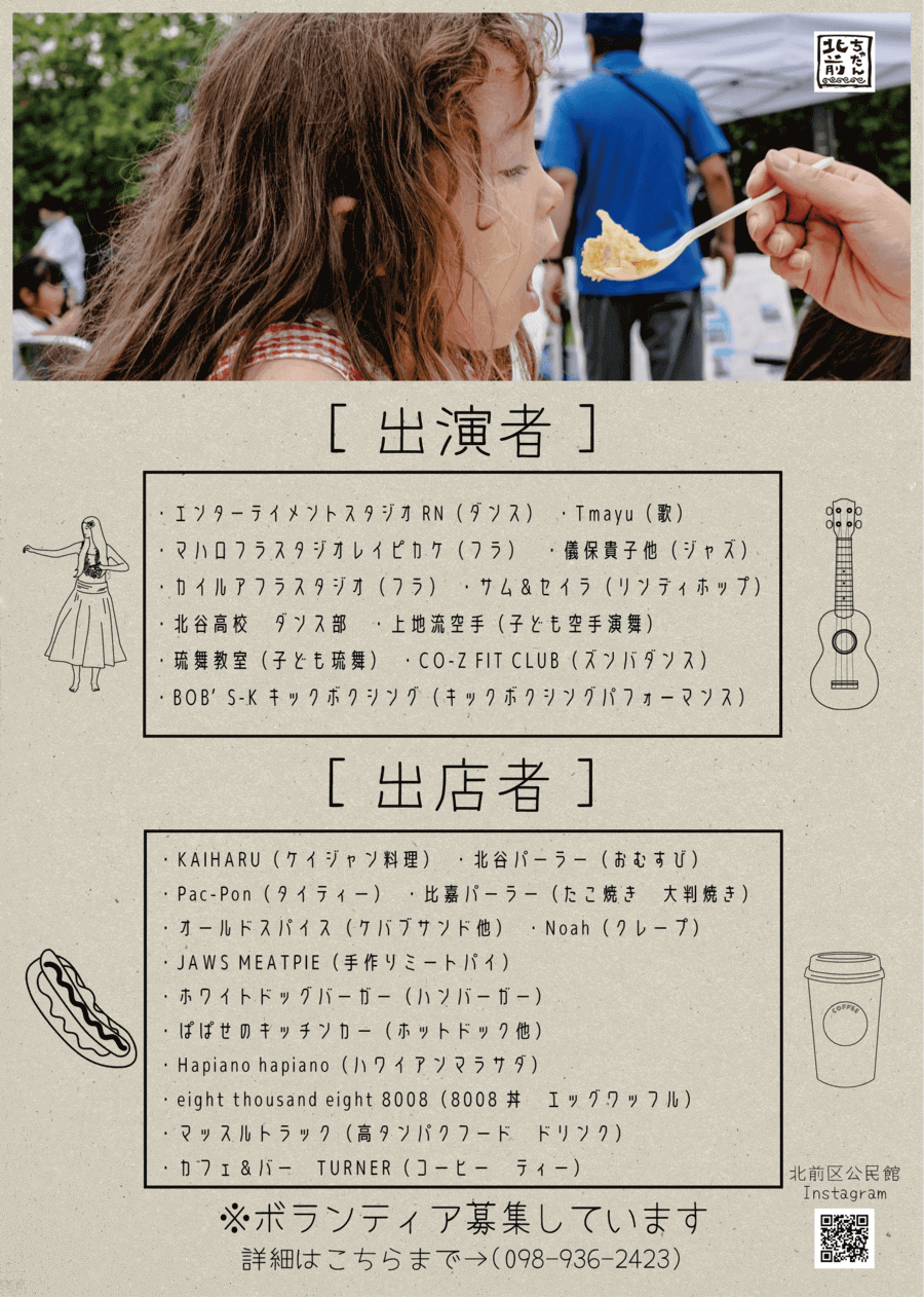 3年ぶりの開催となる北前祭りだが、メインとなるのはステージイベントとキッチンカーなどのフードブース。北前区公民館のグラウンドでは、地域の住民たちによる歌やダンス、空手や琉舞、エイサー、キックボクシングなどのパフォーマンスが披露される予定だ。