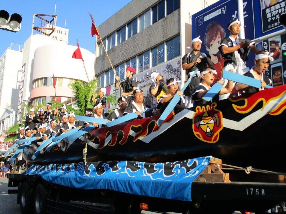 パレードを先導する「地バーリー」は、那覇市の無形民俗文化財にも指定されている伝統芸能。御材木とともに、爬竜船(はりゅうせん)の漕ぎ手たちの勇壮な歌と掛け声が楽しめる。
