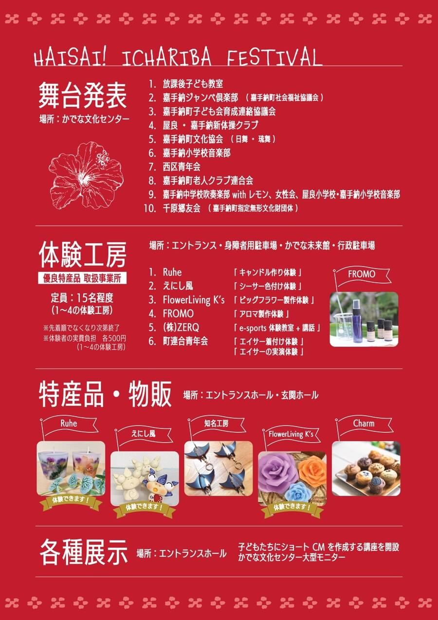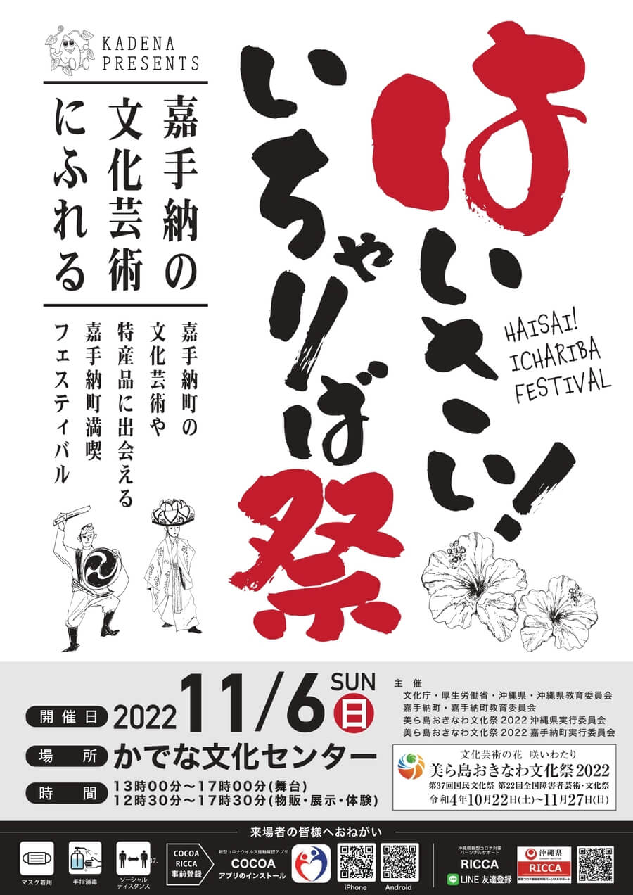 2022年11月6日(日)に、嘉手納町にあるかでな文化センターにて「はいさい!いちゃりば祭」が開催される。