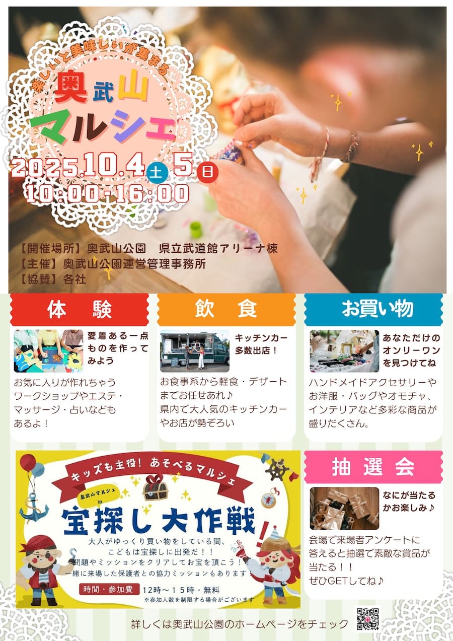 県内で人気のキッチンカーが集まるほか、ハンドメイドのアクセサリーや雑貨などの販売、ものづくりワークショップ、ボディージュエリーやマッサージ系の出店もあり。