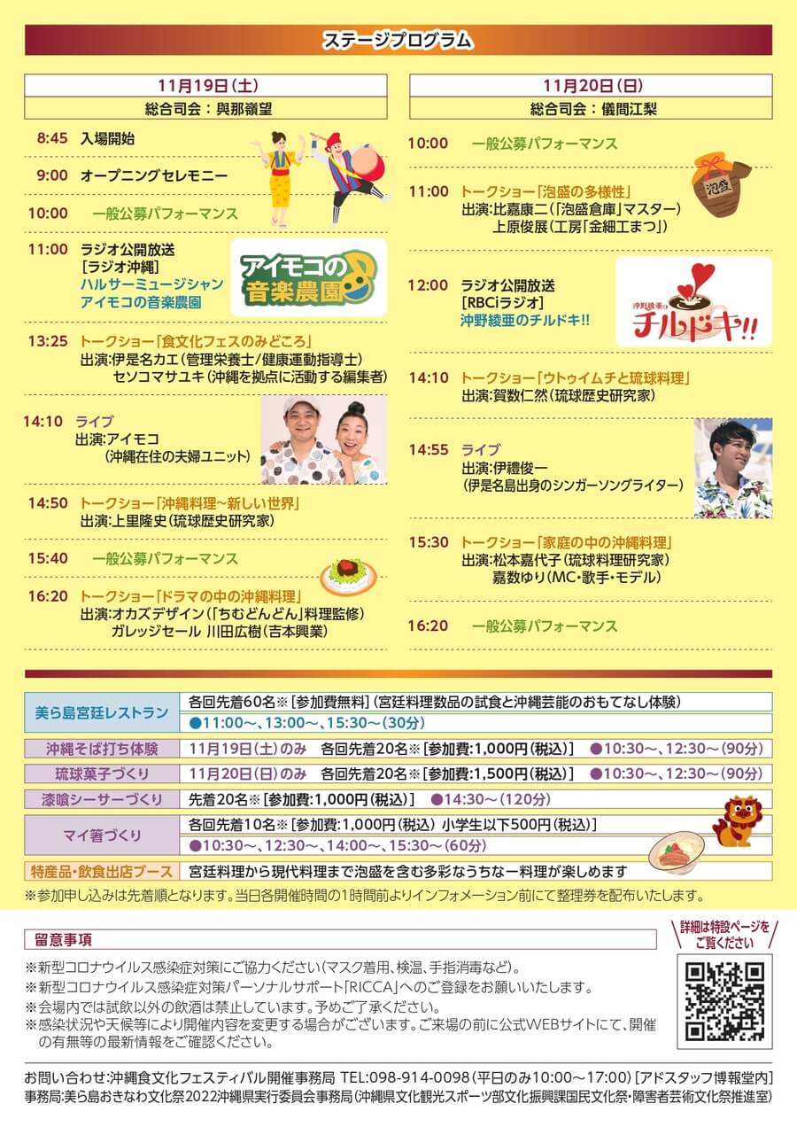 ステージでは、沖縄食文化に関する各種トークショーやラジオの公開生放送、音楽ライブを実施。