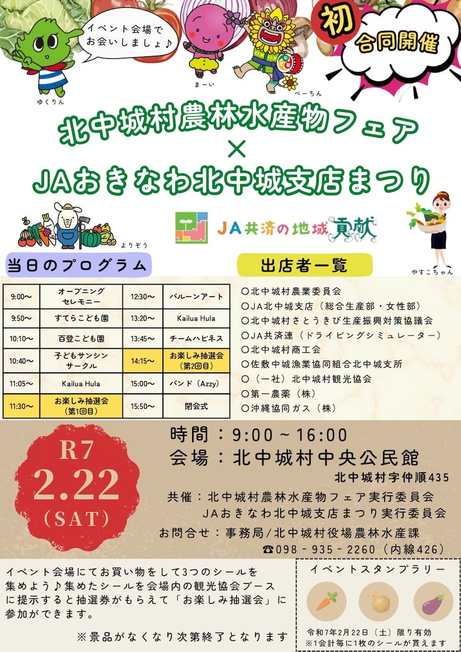 2025年2月22日(土)、北中城村立中央公民館にて「北中城村農水産物フェア2023」が開催される。今回はJAおきなわ北中城支店まつりと初の合同開催。