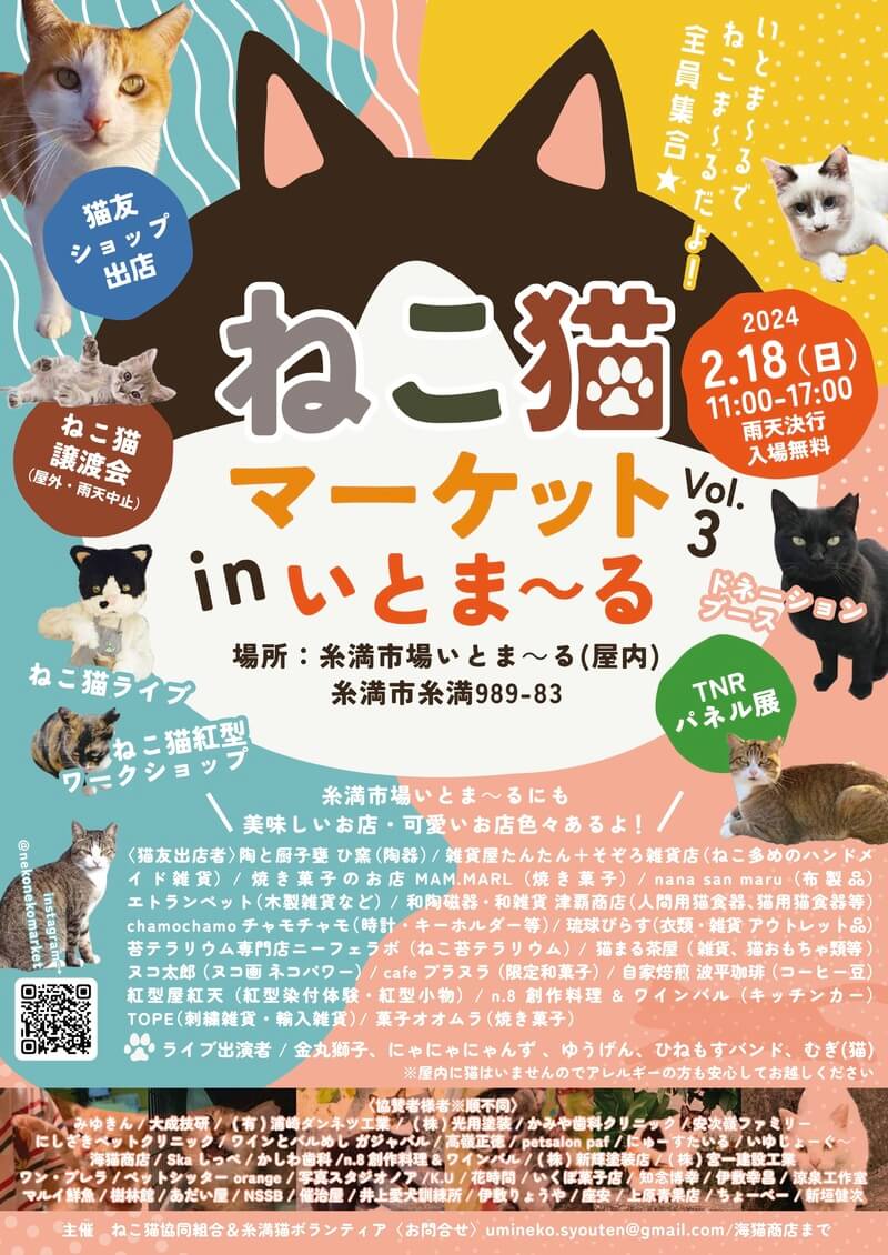 2024年2月18日(日)に、糸満市場いとま~るにて「ねこ猫マーケット vol.3 in いとま~る」が開催される。