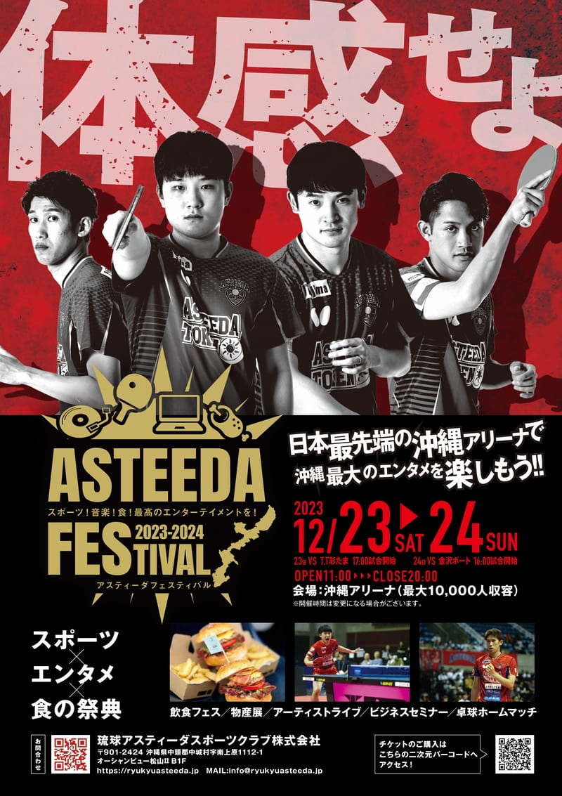 2023年12月23日(土)・24日(日)、沖縄アリーナで「アスティーダフェスティバル」が開催される。沖縄を拠点に活動するプロ卓球チーム「琉球アスティーダ」が主催の、スポーツとエンタメ、食を楽しめるイベントだ。