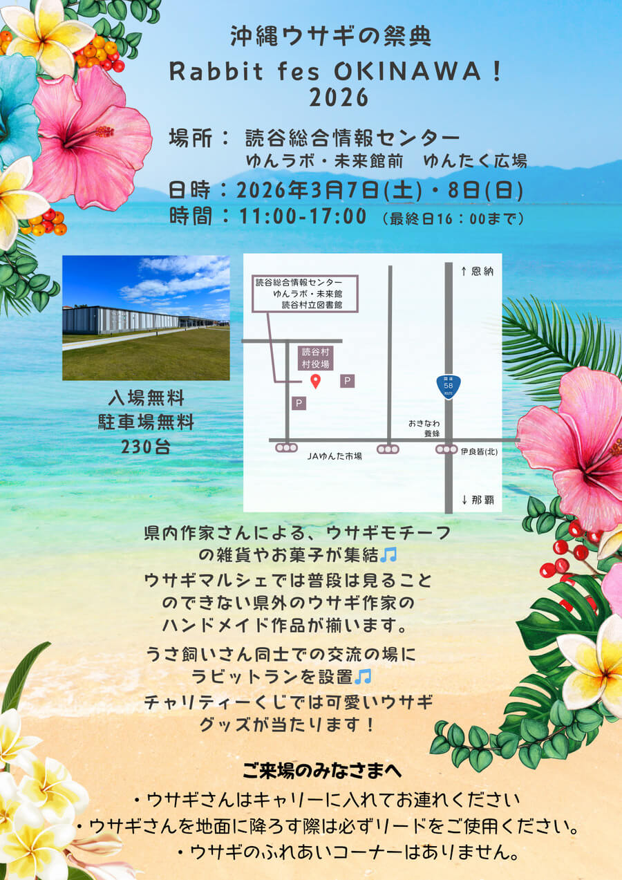 2026年3月7日(土)・8日(日)の2日間、「Rabbit Fes Okinawa!」が開催される。会場は、図書館やスターバックスも入る話題の施設、読谷村総合情報センター「ゆんラボ・未来館」前のゆんたく広場。