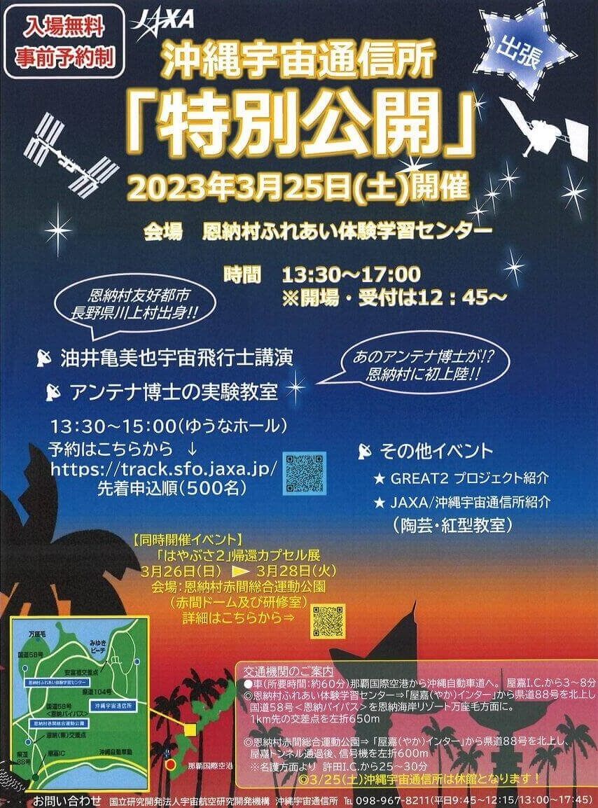 2023年3月25日(土)、恩納村ふれあい体験学習センターにて「出張特別公開 油井宇宙飛行士講演会&展示イベント」が行われる。