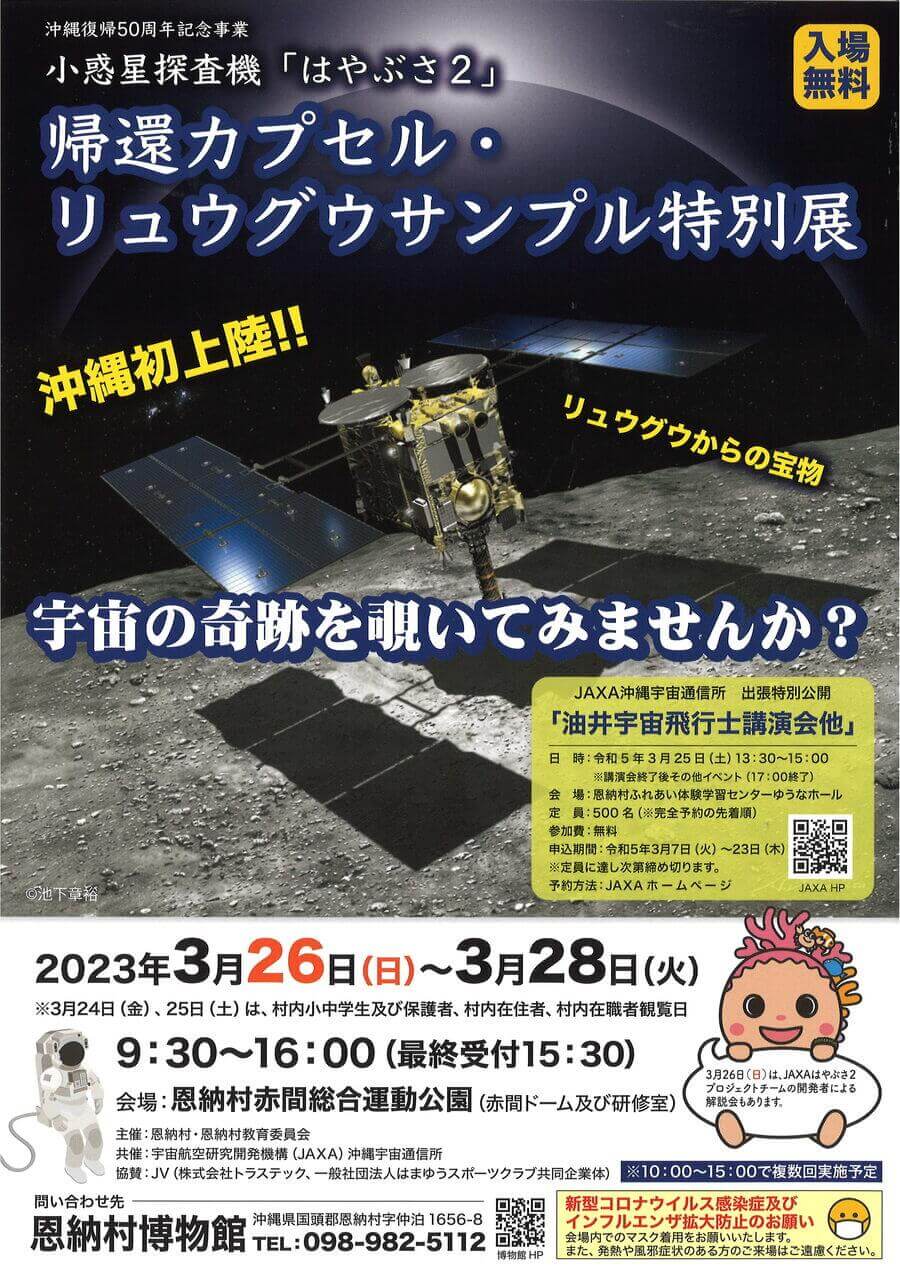 また、恩納村赤間総合運動公園では2023年3月26日(日)~3月28日(火)の期間中、「小惑星探査機『はやぶさ2』帰還カプセル・リュウグウサンプル特別展」が同時開催される。