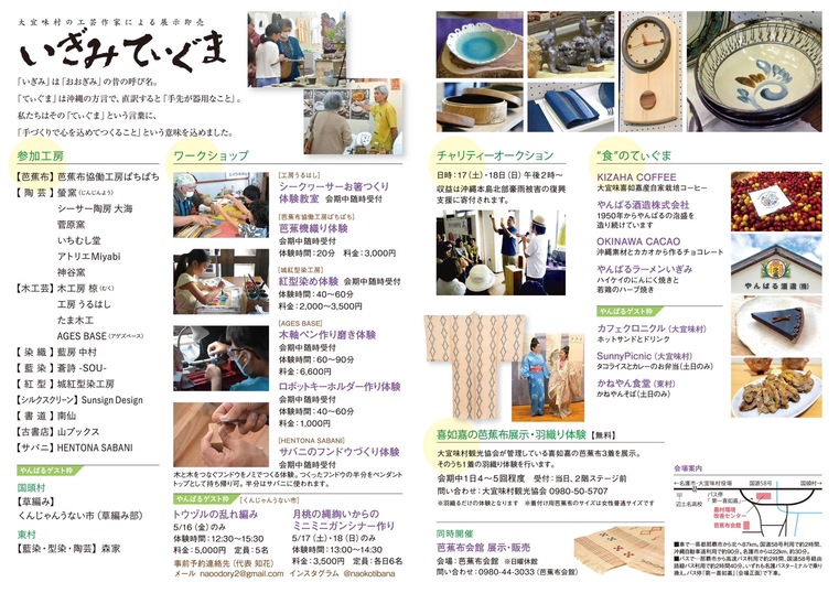 そんな「いぎみてぃぐま」では、大宜味村に縁のある工芸作家が大集合。芭蕉布や陶芸、木工、染織、藍染、紅型など、たくさんの工房が出展し、それぞれの作家自慢の作品の展示即売が行われる。やんばるゲスト枠として、国頭村と東村の工房も出展予定。