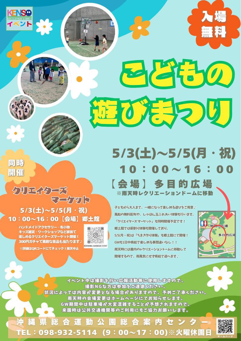 2025年5月3日(土・祝)~5日(月・祝)の3日間、沖縄市の沖縄県総合運動公園で「こどもの遊びまつり」が開催される。