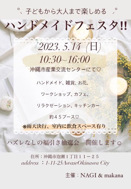 2023年5月14日(日)に、沖縄市の泡瀬漁港内にある沖縄市産業交流センターにて「ハンドメイドフェスタ」が開催される。