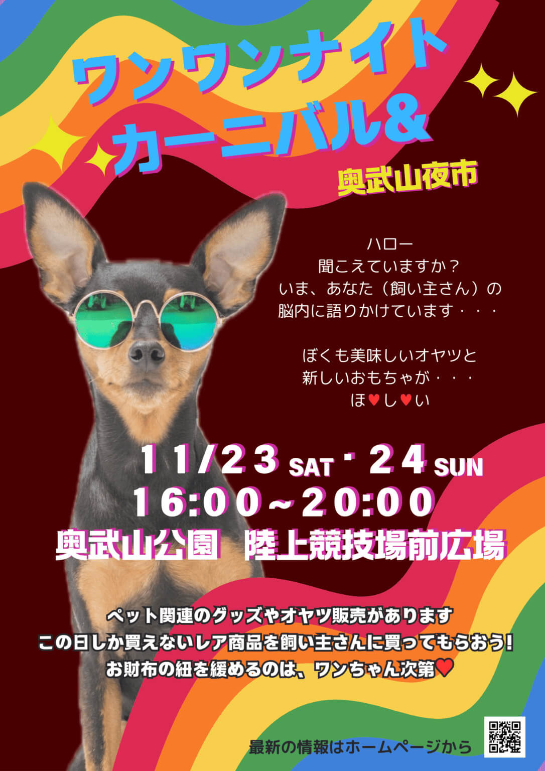 少し日が暮れてくる16時からの開催なので、日光をあまり気にせずにワンちゃんと一緒にイベントを楽しむことができる。ワンちゃんのおやつやおもちゃ、グッズ、洋服などワンちゃん用のアイテムがたくさん販売される予定なので、ワンちゃんが大喜びすること間違いなし。