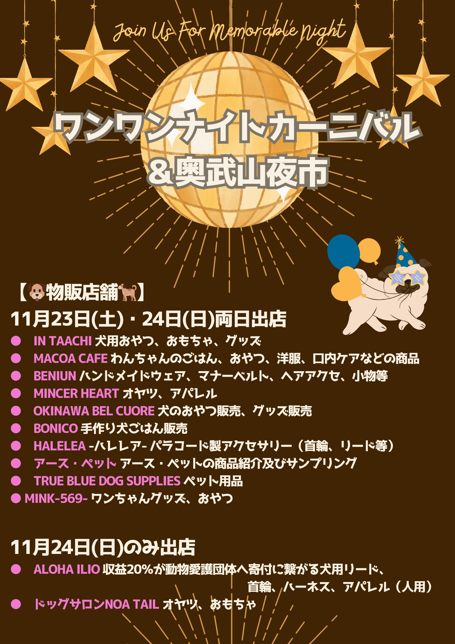 愛犬と楽しめることで人気のイベント「ワンワンナイトカーニバル&奥武山夜市」が、今年も那覇市にある奥武山公園 陸上競技場前で開催される。今年は2024年11月23日(土)・11月24日(日)の2日間の開催だ。
