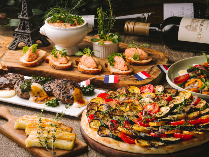 カニ食べ放題の大人気ランチブッフェ。シェフコーナーではじゅわっと肉汁あふれる「和牛入りステーキアッシュ」を提供。ほかにも「クランベリー風味のビーフシチュー」や「秋野菜と鶏腿肉のポワレ」など、秋に旬を迎える国産食材を使い、和の要素とフレンチの要素を絡めた料理を存分に堪能できる。10月限定のハロウィンスイーツも登場。