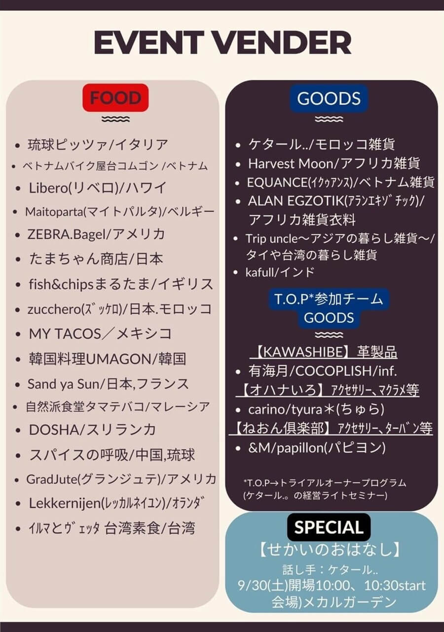 せかいマルシェは、「世界を感じる1日」をコンセプトに、南城市にあるモロッコ雑貨のセレクトショップ「ケタール..」が主催。世界各国のグルメを食べたり雑貨を買ったり、沖縄にいながら外国の文化に触れられる。