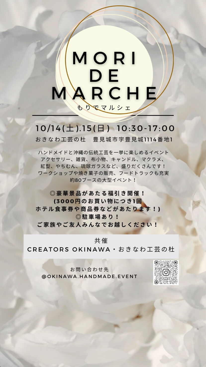 2023年10月14日(土) ・15日(日)の2日間、豊見城市にある「おきなわ工芸の杜」にて「杜deマルシェ」が開催。沖縄県内のハンドメイド作家が約80ブース出店する、大規模なハンドメイドイベントだ。
