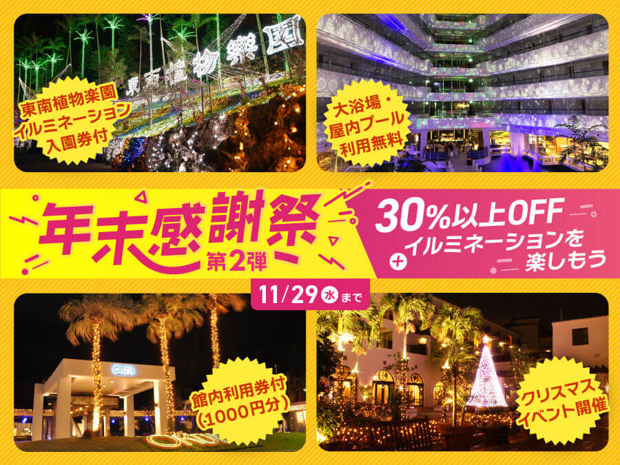 沖縄県民価格でお得にホテル予約ができる「ちゅらとく」では、毎週水曜日・計5回に渡り、30%以上OFFのお得な「年末感謝祭」プランを販売中。