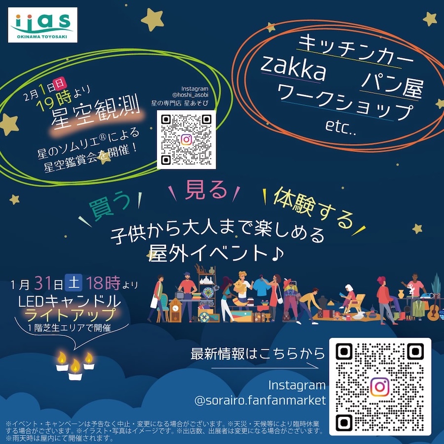 イーアス沖縄豊崎の敷地内で開催されることもあり、小さな子ども連れでも気軽に足を運べるイベント。ぜひ家族や友人を誘って、ショッピングやグルメとナイトマーケットを楽しんではいかが。