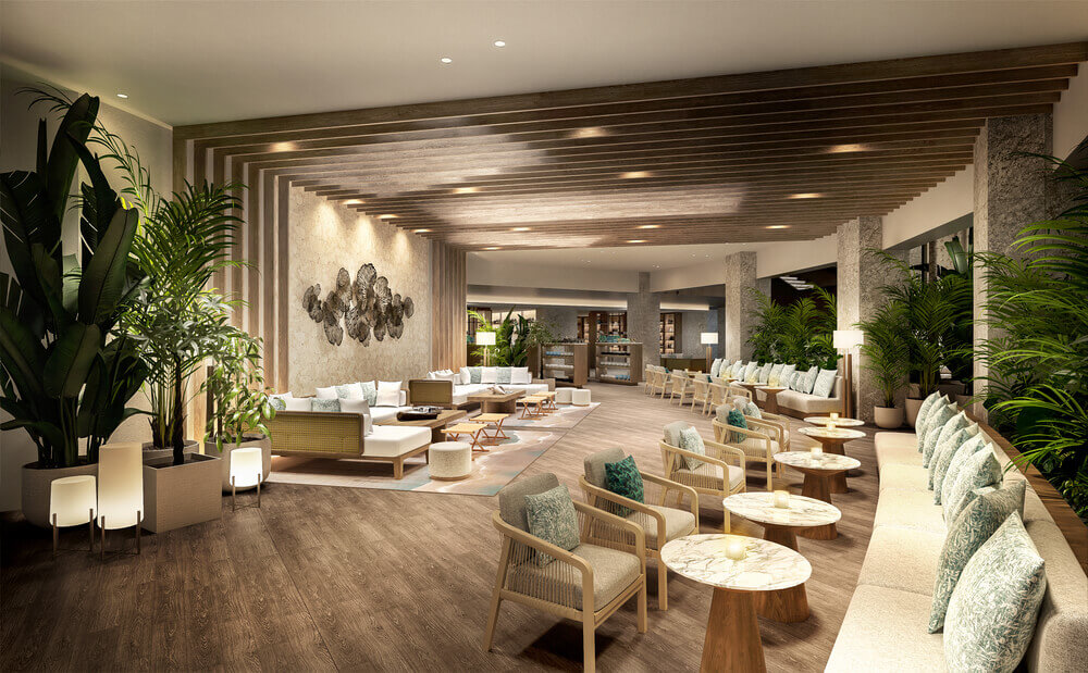 ロビー館内に足を一歩踏み入れると、曲線を生かした開放的なロビーが広がる。あちこちに植物が配置され、南国らしい雰囲気を醸し出している。