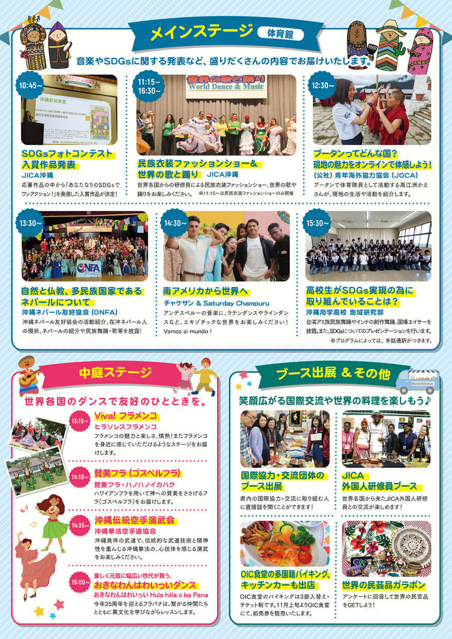 世界中から集まったJICAの外国人研修員との交流ブースや国際協力・国際交流を行っている沖縄県内団体のブースもあるため、国際交流に興味がある学生や社会人にもおすすめのイベントだ。