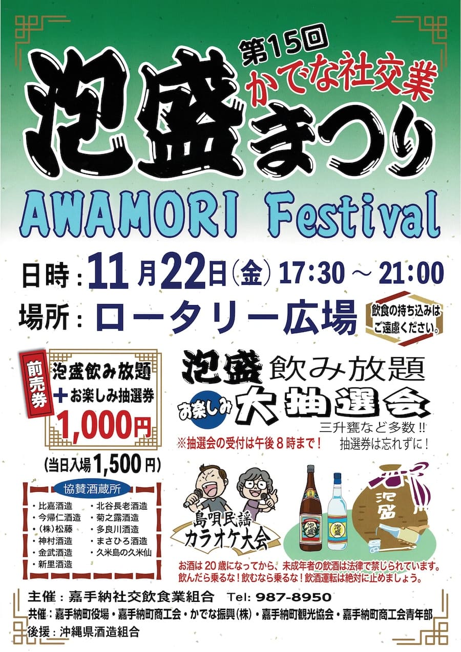 2024年11月22日(金)、嘉手納町のロータリー広場で「第15回 社交業泡盛まつり」が開催される。