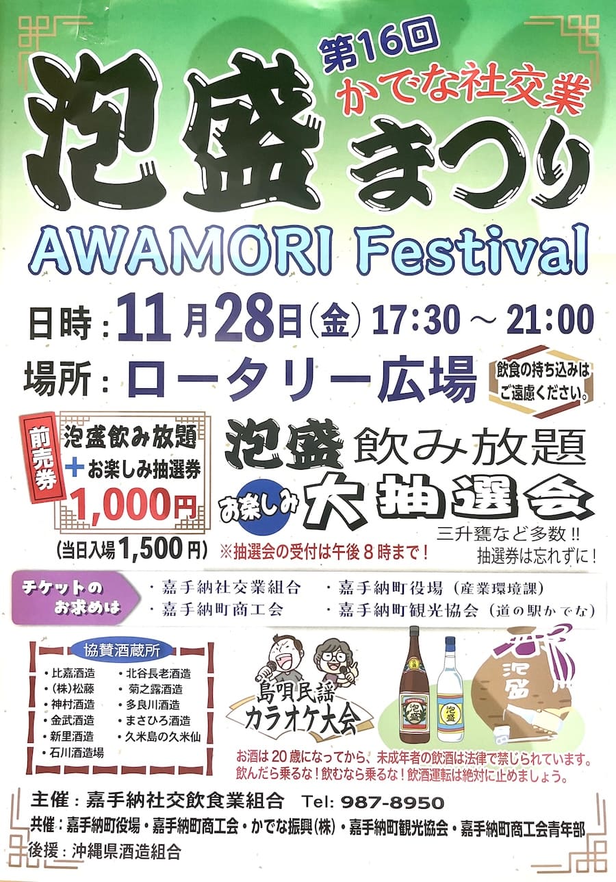 2025年11月28日(金)、嘉手納町のロータリー広場で「第16回 かでな社交業 泡盛まつり」が開催される。