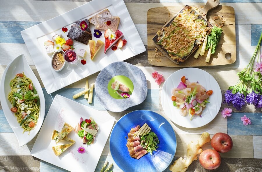 「旬の味覚と世界の料理」をテーマに、シェフが市場で直接目利き・買い付けた旬の採れたて野菜や食材を使ったメニューを楽しめるランチブッフェだ。