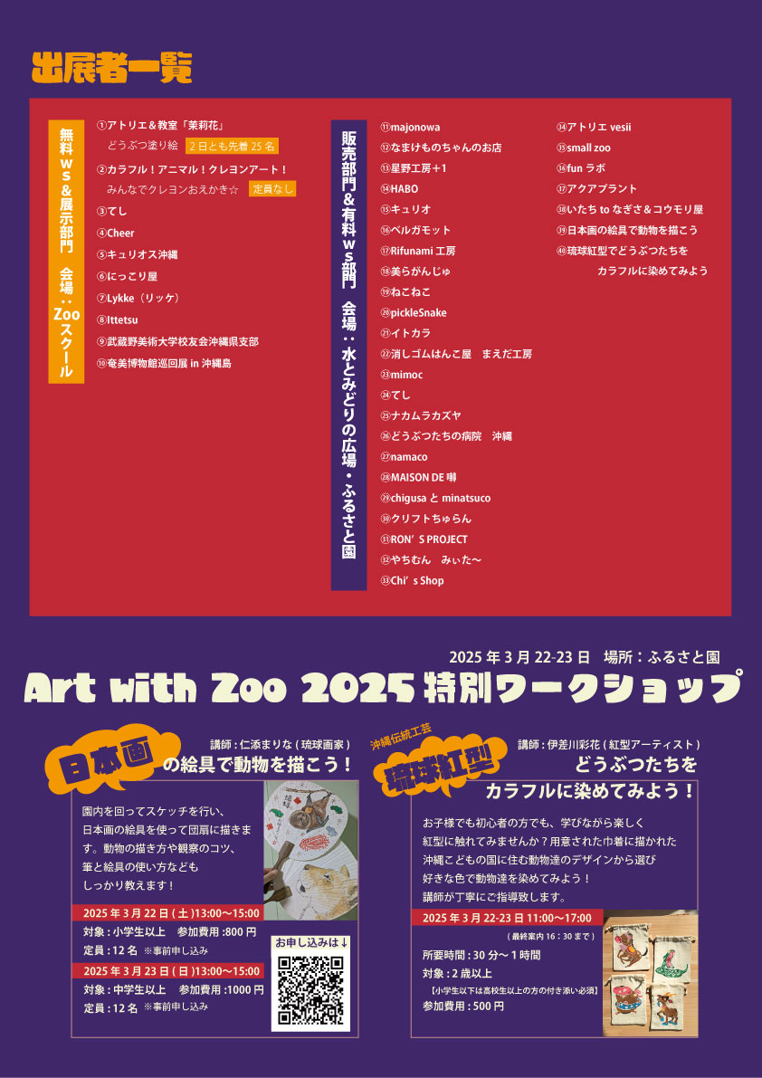 「沖縄の自然」と「沖縄こどもの国の動物」をテーマに県内外からものづくり作家が集まり、ひと味違ったオリジナル作品の販売や展示、日本画家による特別ワークショップを実施する。イベント会場では作家から説明を聞いたり交流できるため、芸術とも触れ合えるいい機会になるだろう。