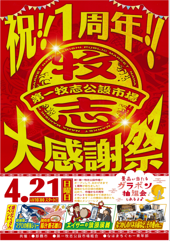 2024年4月21日(日)、那覇市の第一牧志公設市場で「祝!!1周年!!第一牧志公設市場大感謝祭」が開催される。