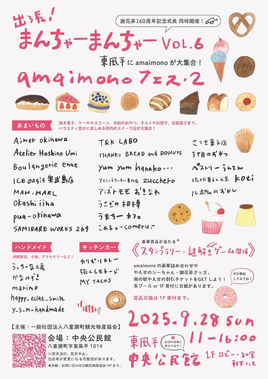 2025年9月28日(日)に沖縄本島南部の八重瀬町・東風平の中央公民館にて「出張!まんちゃーまんちゃー VOL.6 amaimonoフェス2」が開催される。