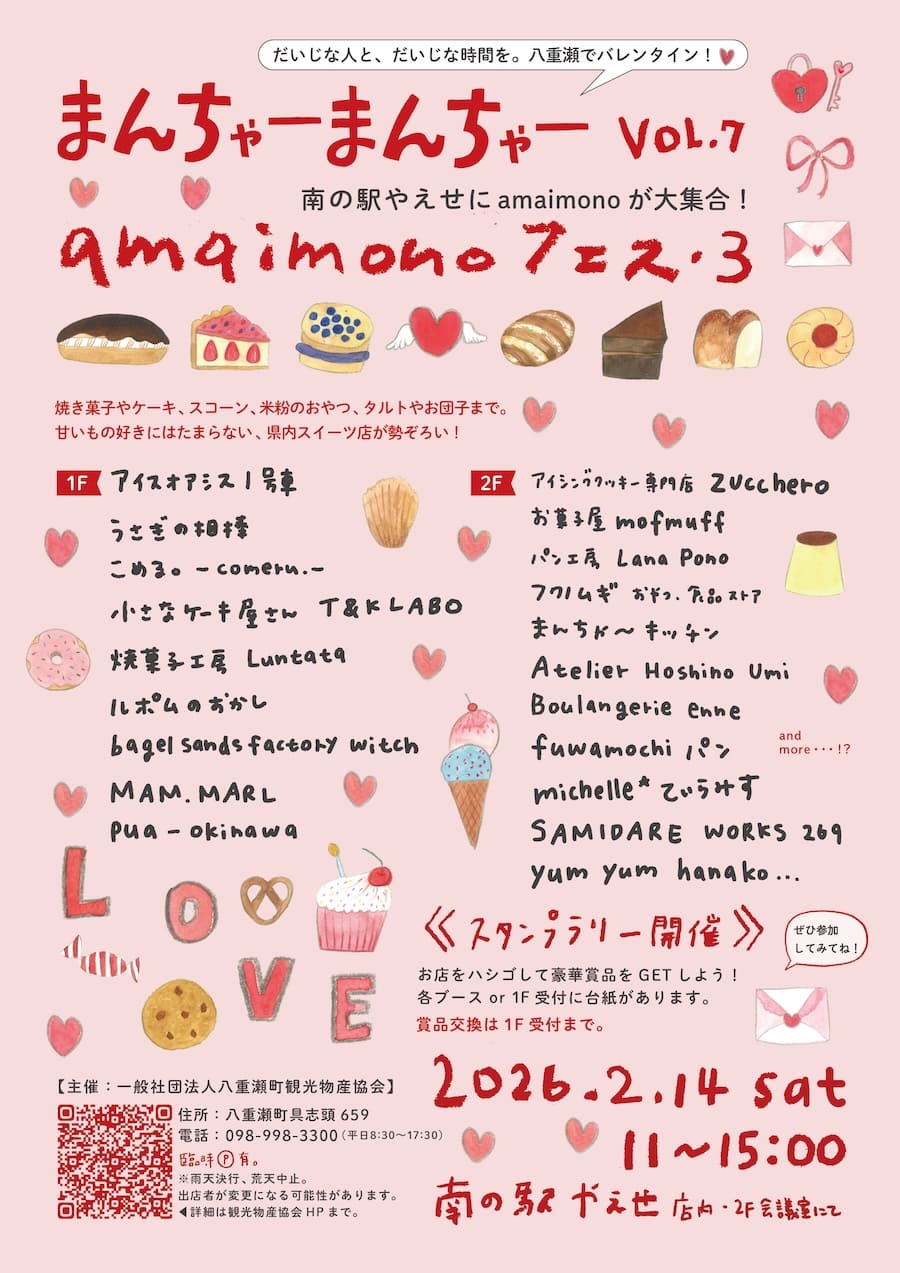 2026年2月14日(土)のバレンタインデーに、八重瀬町にある南の駅やえせにて「まんちゃーまんちゃー VOL.7 amaimonoフェス3」が開催される。