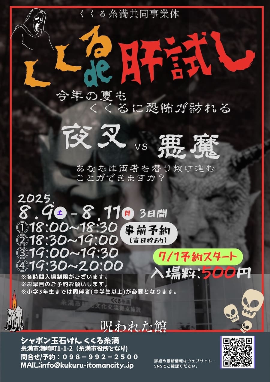 3歳以下は無料。2025年7月1日(月)から予約が始まっているので、参加希望の方はお早めに。いつもと違った雰囲気のくくる糸満で、ここでしか味わえないゾクゾクする恐怖体験を味わってみてはいかが。