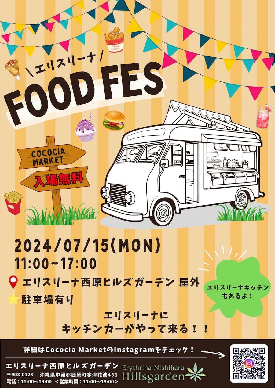 2024年7月15日(月・祝)、西原町にある結婚式場・エリスリーナ西原ヒルズガーデンで「Food Fes in エリスリーナ」が開催される。