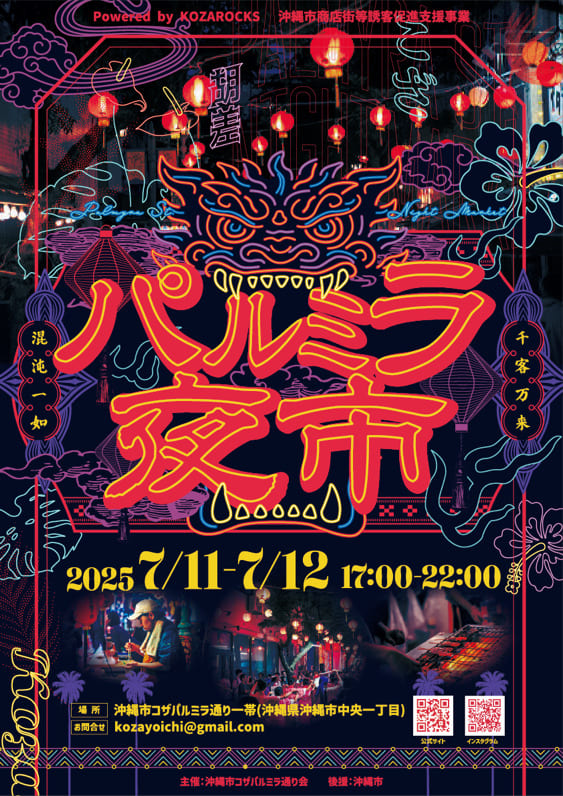 2025年7月11日(金)・12日(土)はランタンで明るく照らされたパルミラ通りに、屋台や飲食店が並び、台湾風グルメやちょい飲みを楽しめる飲食店が多数出店。台湾の食文化と活気あふれるコザの地域文化を堪能できる。
