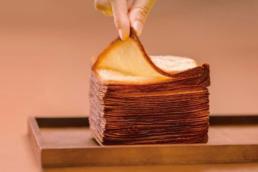 生地に使用されているのは、国産小麦と北海道産発酵バター。これらを贅沢に使用し、空気をバランスよく空気を含ませることで、⼩⻨とバターの味わいを引き⽴てている。